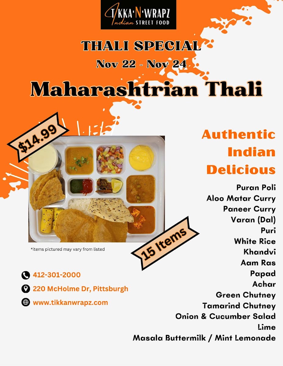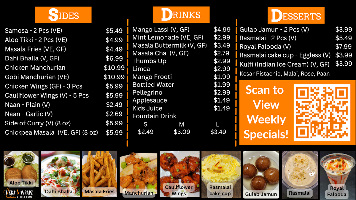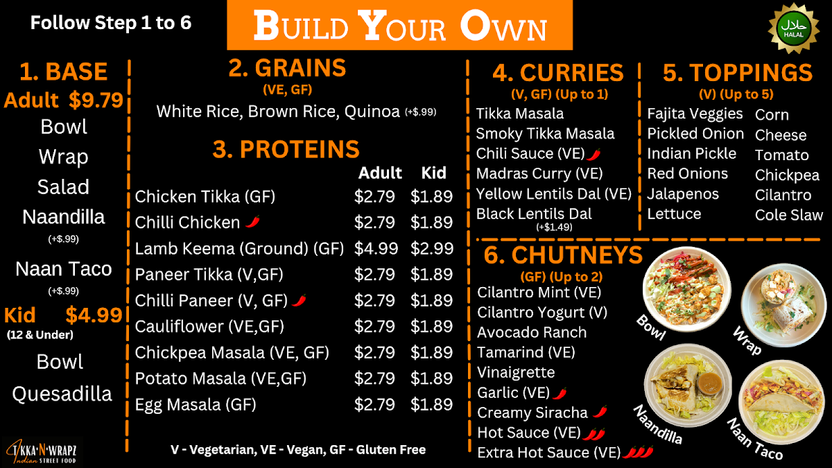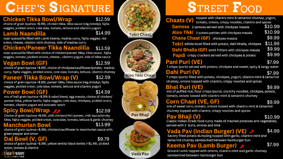 Bowl/wrap made with choice of grain, choice of chili chicken/chili paneer, spicy chili sauce/smoky tikka sauce, fajita, pickled onions, cole slaw and garlic chutney